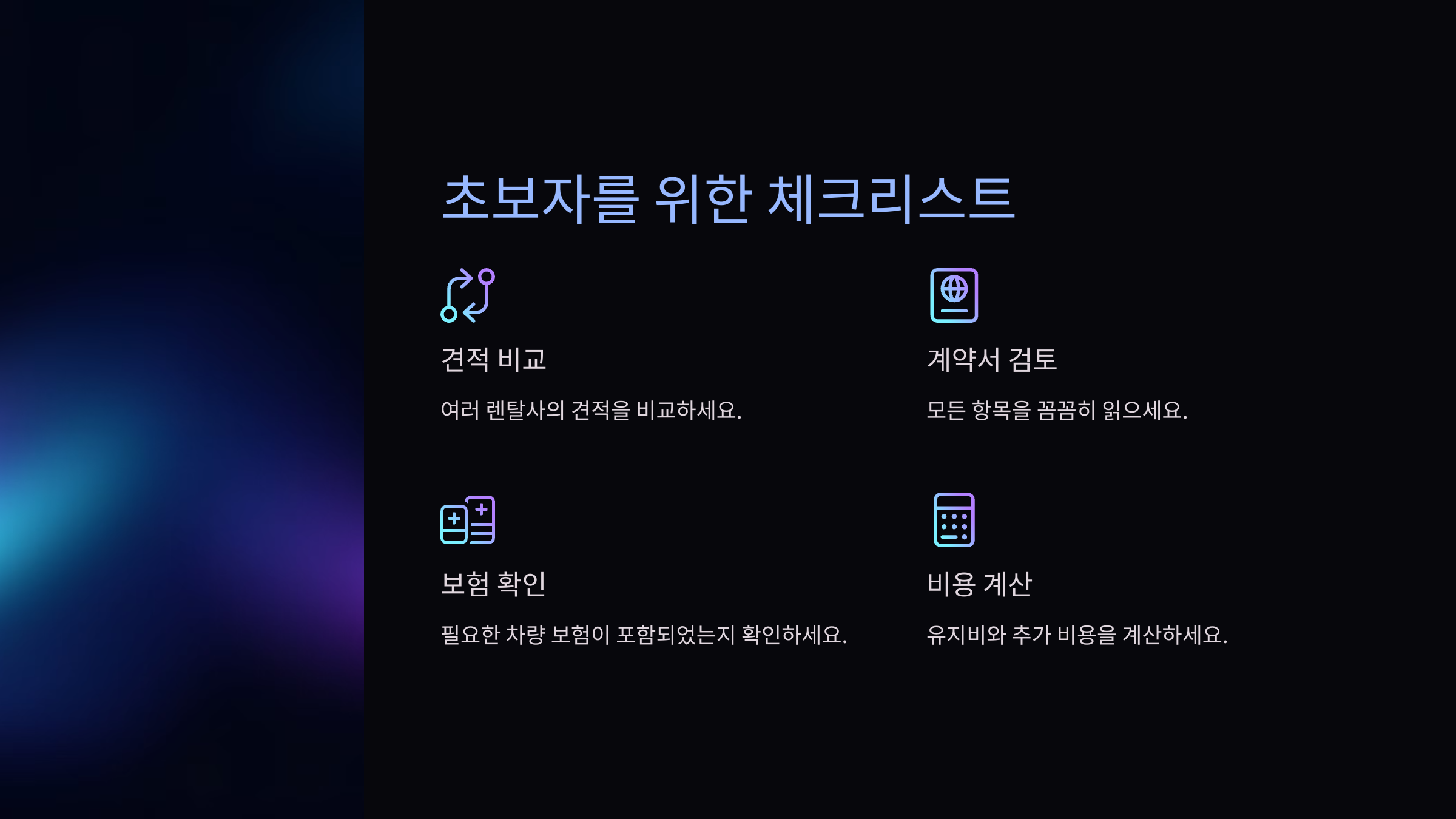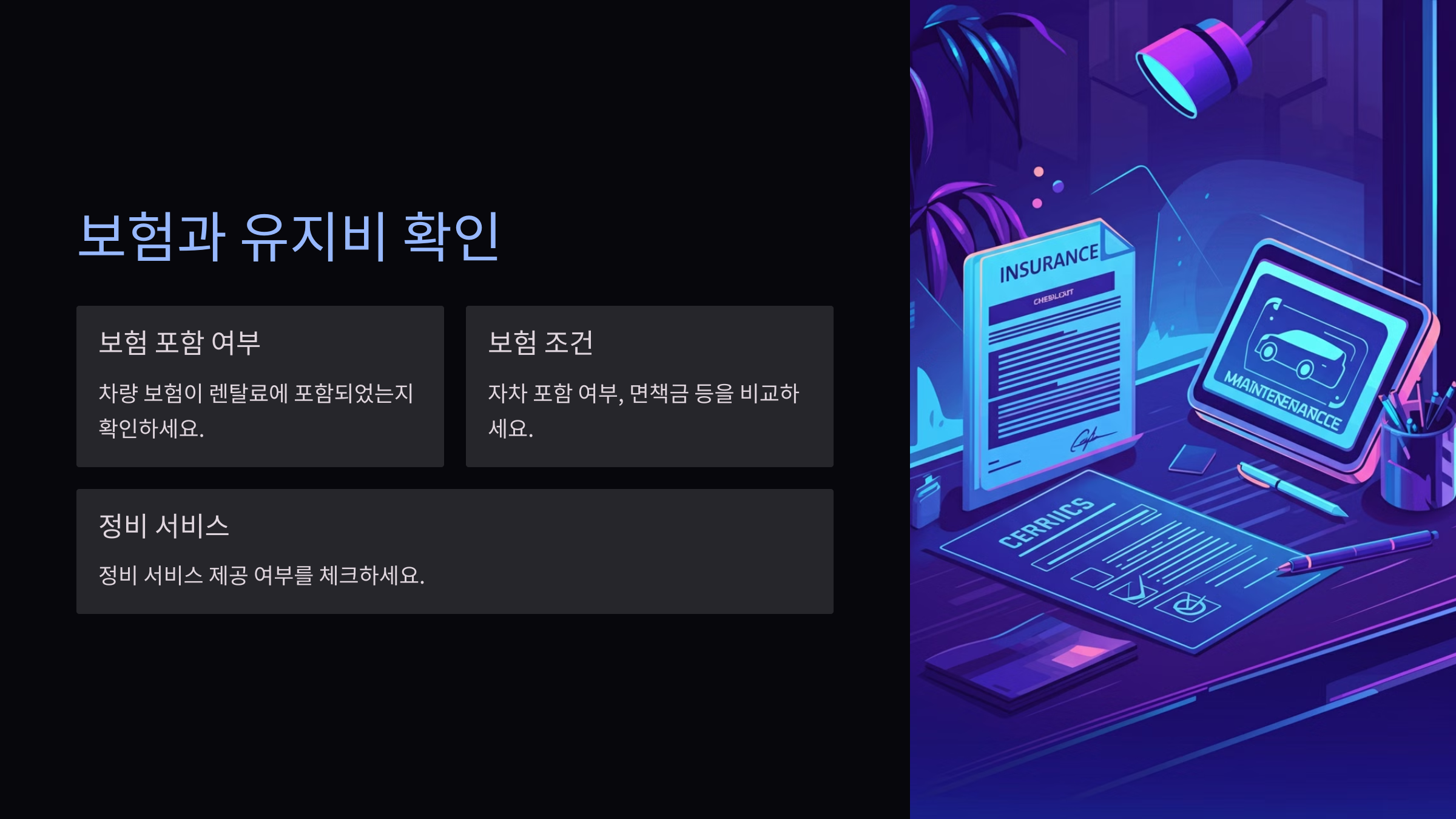 - 보험 조건(자차 포함 여부, 면책금 등)을 비교해 예상치 못한 지출을 피하세요.