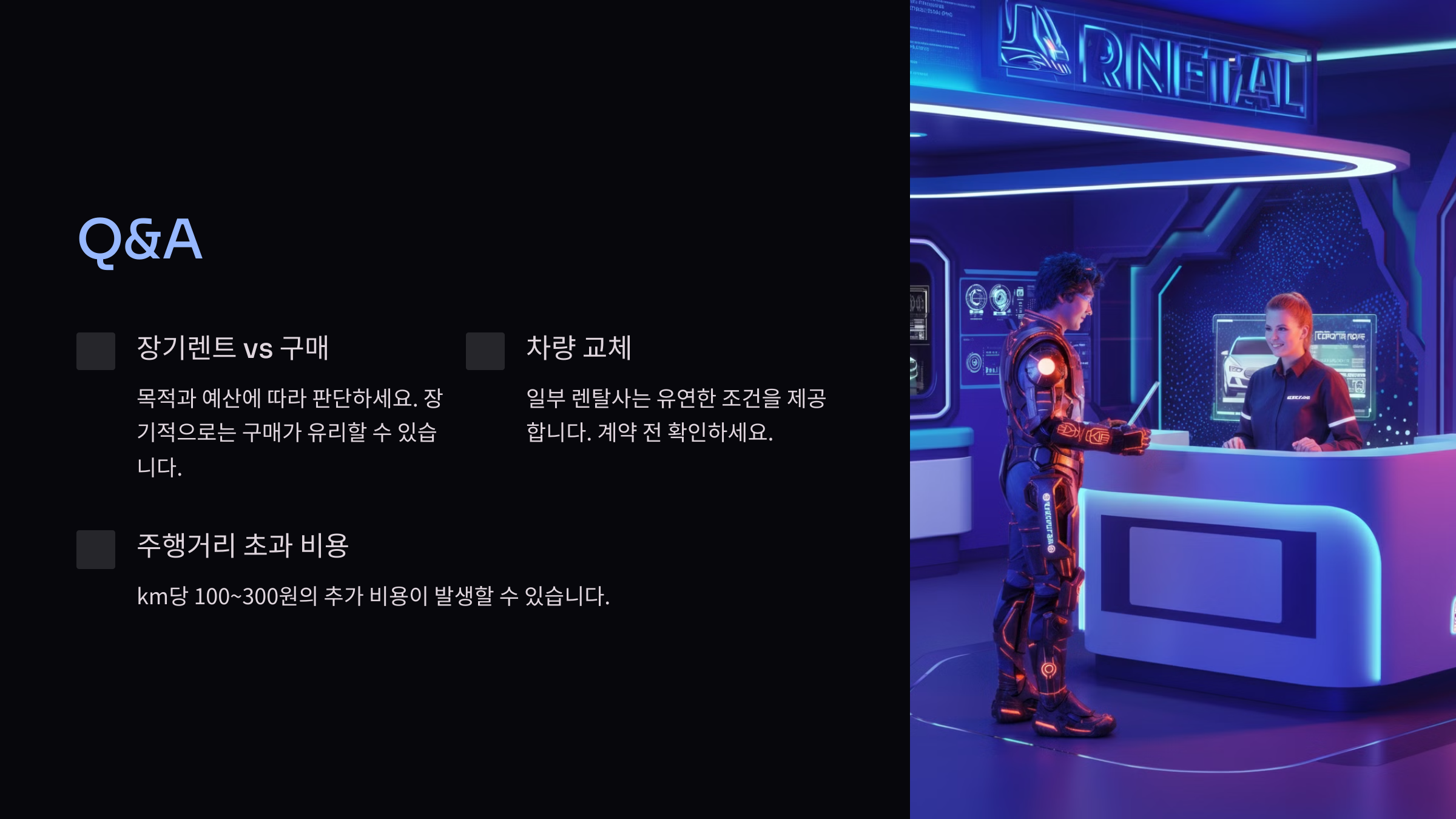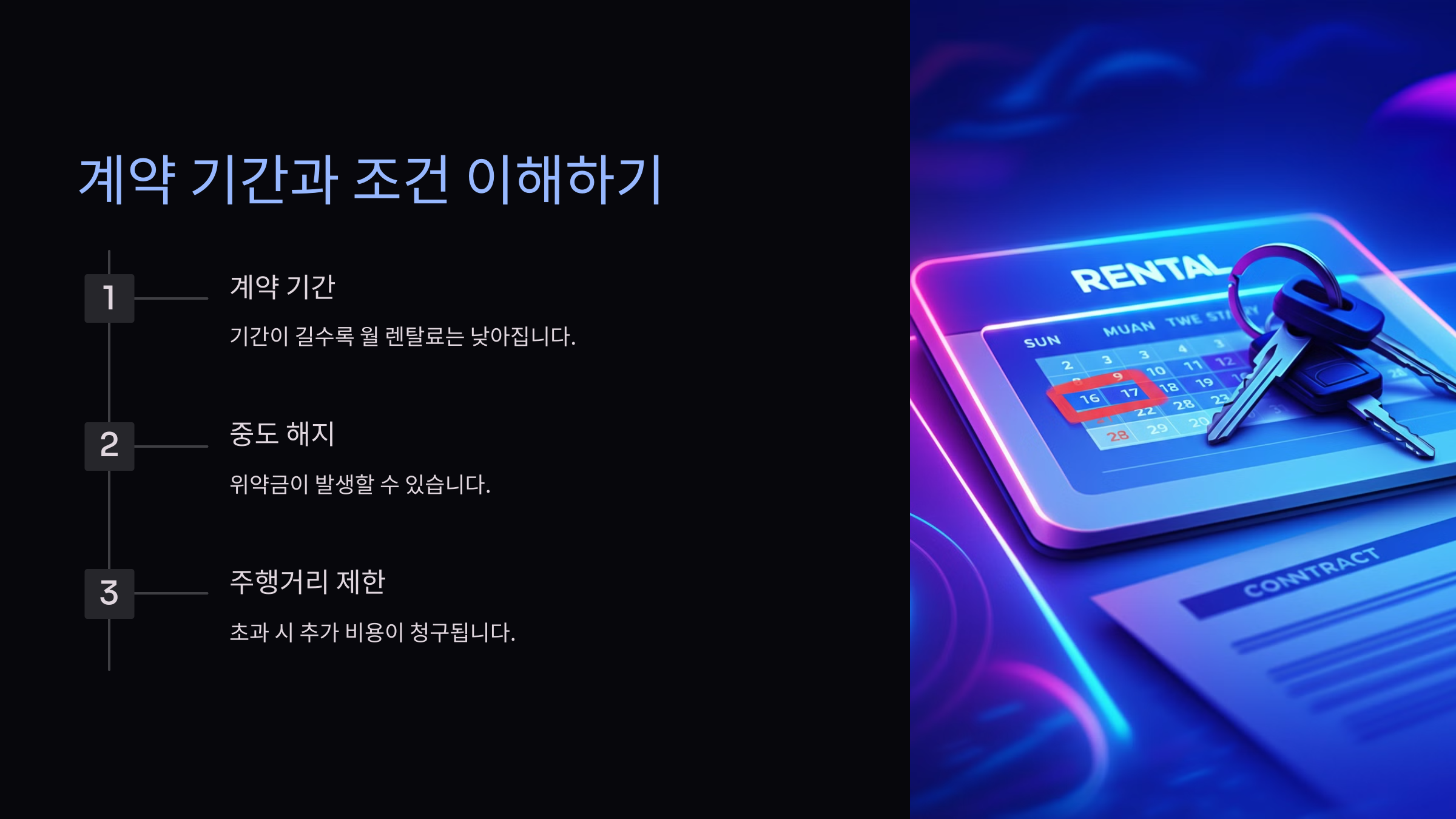 - 숨겨진 비용에 주의하세요. 일부 업체는 보험료, 정비 비용 등을 별도로 청구합니다. ⚠️