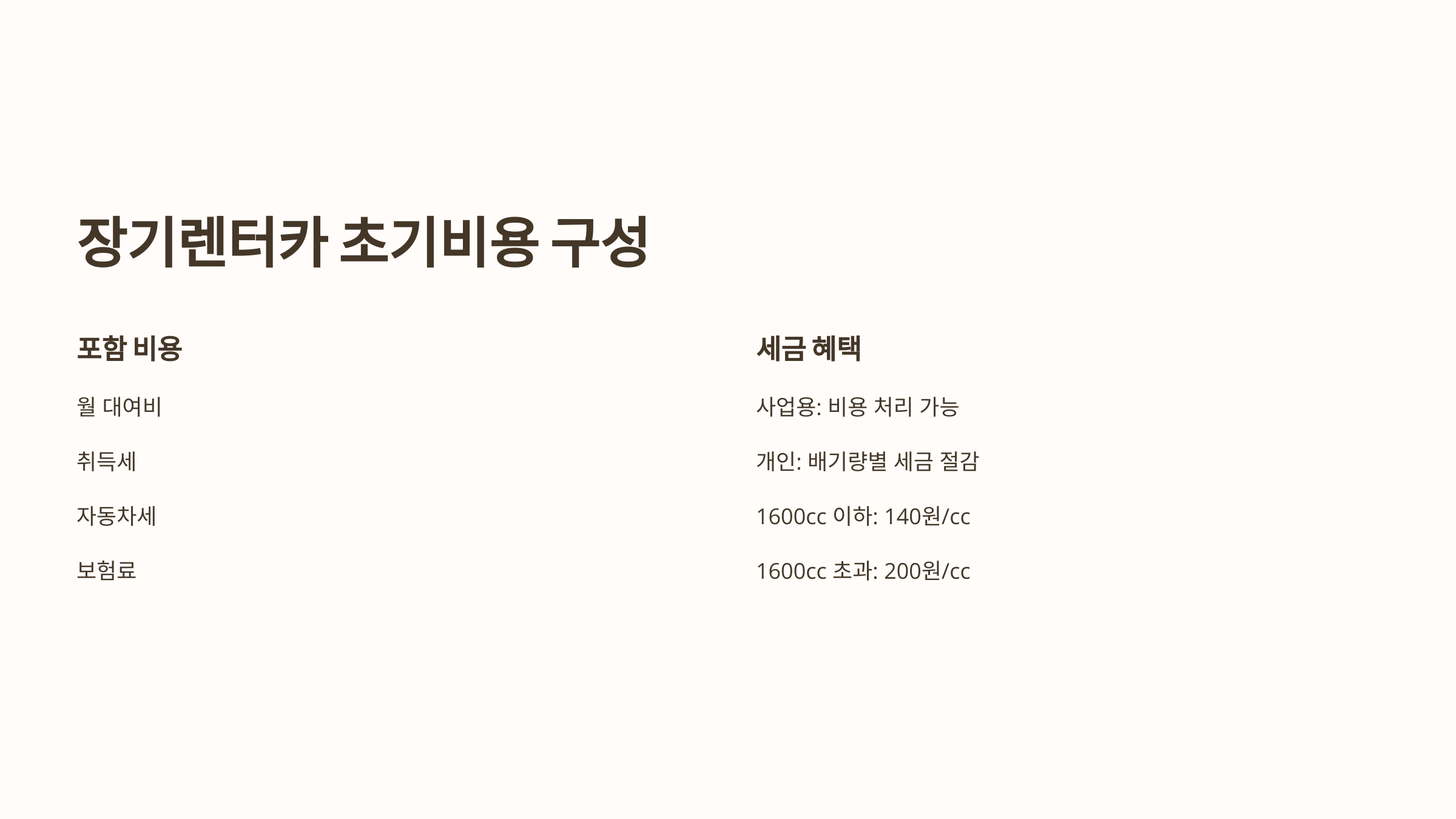 🚗 신차 장기렌터카 초기비용 완전 정리 신차 장기렌터카를 계약할 때 월 렌탈료에 어떤 항목들이 포함되는지 꼭 확인해야 해요. 대부분의 렌트 상품은 자동차세, 보험료, 정비비용까지 포함돼 있어서 관리가 편하다는 게 가장 큰 장점이죠! 💡